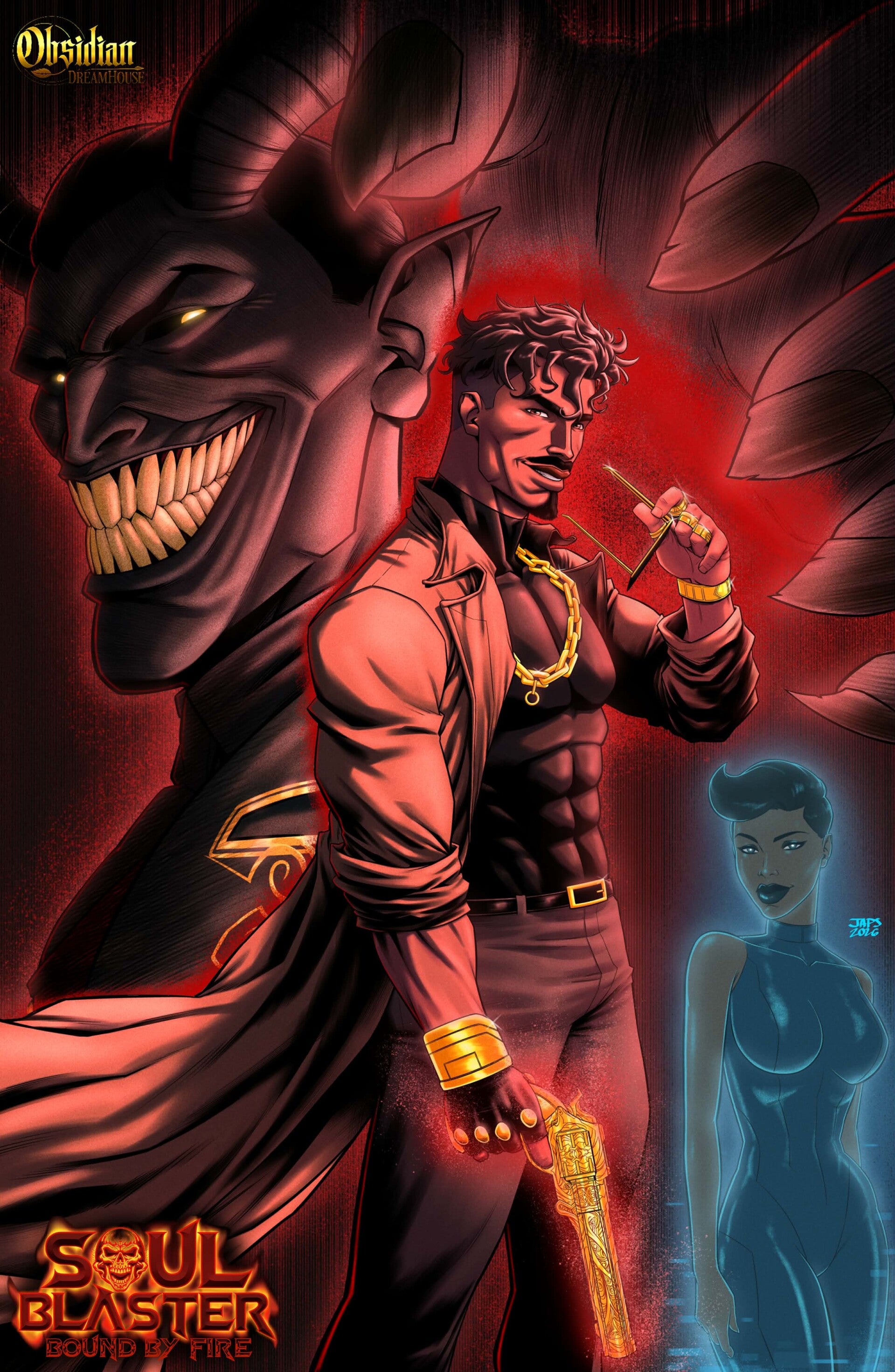 Bring the world of Soul Blaster to your wall with this striking collector poster. Featuring bounty hunter Coyote Treadway, the cursed Ender revolver, the sinister presence of Vakorr, and the holographic AI Vella, this artwork captures the dark sci-fi western tone of the series.